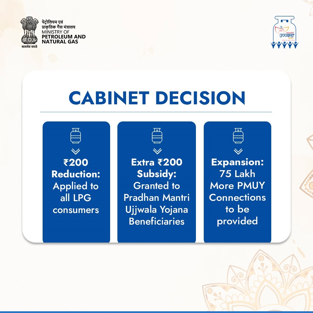 29 AUG 2023 प्रधानमंत्री श्री नरेन्द्र मोदी ने सभी एलपीजी उपभोक्ताओं यानी 33 करोड़ गैस कनेक्शन वालों के लिए एलपीजी सिलेंडर की कीमत 200 रुपये प्रति सिलेंडर कम करने का निर्णय लिया है।श्री मोदी ने कहा कि रक्षाबंधन का पर्व हमारे परिवार में खुशियां बढ़ाने का दिन होता है।पीएम उज्ज्वला योजना के उपभोक्ताओं को उनके खाते में 200 रुपये प्रति सिलेंडर की सब्सिडी मिलती रहेगी।सरकार ने 75 लाख अतिरिक्त पीएम उज्ज्वला कनेक्शन को भी मंजूरी दे दी है, जिससे पीएमयूवाई लाभार्थियों की कुल संख्या 10.35 करोड़ हो जाएगी।केन्द्रीय पेट्रोलियम एवं प्राकृतिक गैस मंत्री श्री हरदीप सिंह पुरी के एक्स थ्रेड का जवाब देते हुए, प्रधानमंत्री ने एक्स पर पोस्ट किया; “रक्षाबंधन का पर्व अपने परिवार में खुशियां बढ़ाने का दिन होता है। गैस की कीमतों में कटौती होने से मेरे परिवार की बहनों की सहूलियत बढ़ेगी और उनका जीवन और आसान होगा। मेरी हर बहन खुश रहे, स्वस्थ रहे, सुखी रहे, ईश्वर से यही कामना है।”