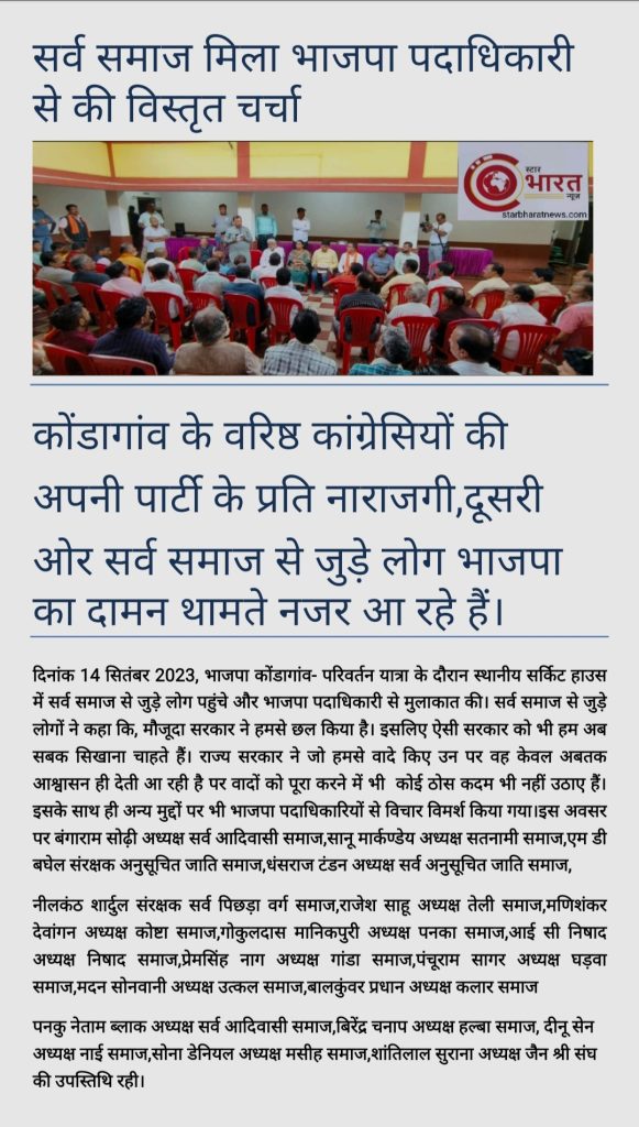 विधानसभा 2023 की तैयारियों के लिये सभी बीएलओ को दिया गया प्रषिक्षण कोण्डागांव, 29 सितम्बर 2023/ कलेक्टर दीपक सोनी के निर्देशन में को कोण्डागांव, केशकाल और नारायणपुर विधानसभा के समस्त बूथ लेवल अधिकारियों की मीटिंग एवं ट्रेनिंग सीईओ जिला पंचायत प्रेम प्रकाश शर्मा एवं उप जिला निर्वाचन अधिकारी सीमा ठाकुर की उपस्थिति में किया गया।…