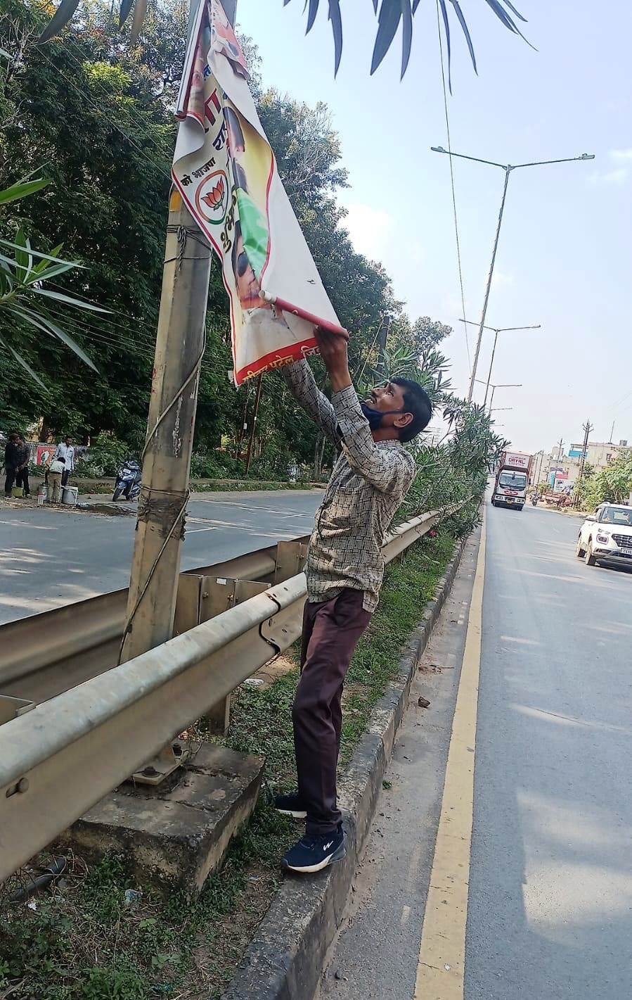 कोण्डागांव, 9 अक्टूबर 2023/ भारत निर्वाचन आयोग द्वारा सोमवार 9 अक्टूबर को विधानसभा निर्वाचन 2023 के कार्यक्रम की घोषणा के साथ ही कोंडागांव जिले में आदर्श आचरण संहिता के पालन हेतु कलेक्टर एवं जिला निर्वाचन अधिकारी श्री दीपक सोनी द्वारा दिए गए निर्देशों के अनुसार समस्त नगरीय और ग्रामीण क्षेत्रों में लगाए गए राजनैतिक पदाधिकारियों या कार्यकर्ताओं की फोटो आदि लगी सभी प्रकार के होर्डिग्स, पोस्टर्स, बैनर आदि को हटाने की कार्यवाही नगर पालिका, नगर पंचायत, ग्राम पंचायत एवं अन्य निर्माण एजेंसियों के माध्यम से सुनिनिश्चित की जा रही है।